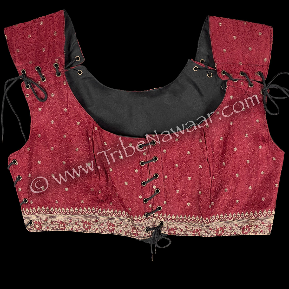 Eco-chic and environmentally-friendly, our Regal Red bodice is newly constructed and assembled with vintage sari fabric. Accents of metallic embroidery add interest. The inside is lined with sturdy new black cotton fabric.