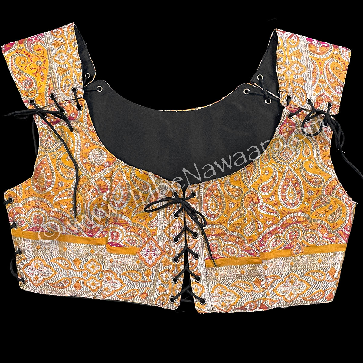 Eco-chic and environmentally-friendly, our Saffron Sunrise bodice is newly constructed and assembled with vintage sari fabric. The inside is lined with sturdy new black cotton fabric.