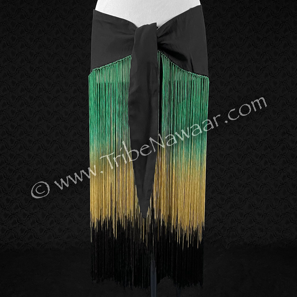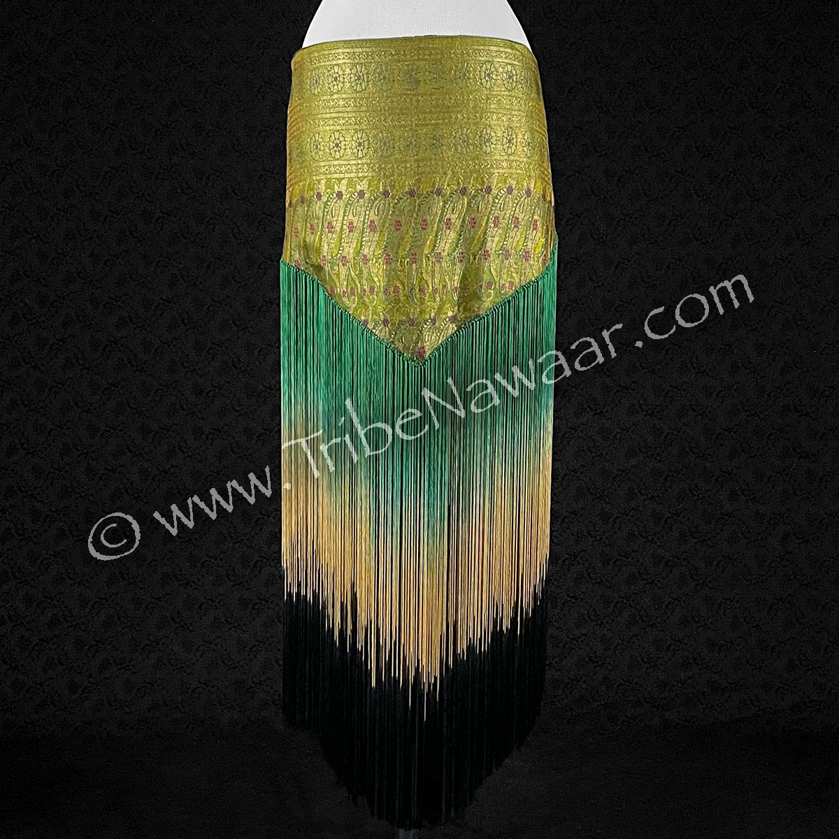 The ties allow these to fit a variety of sizes. Sari sections are about 39″ long across horizontally and about 15″ at the longest point down the center. Fringe is about 23″ long (can be cut for our shorter dancer friends). Both ends of scarf have about 21″ long ties.. allowing these to fit a large variety of sizes easily.