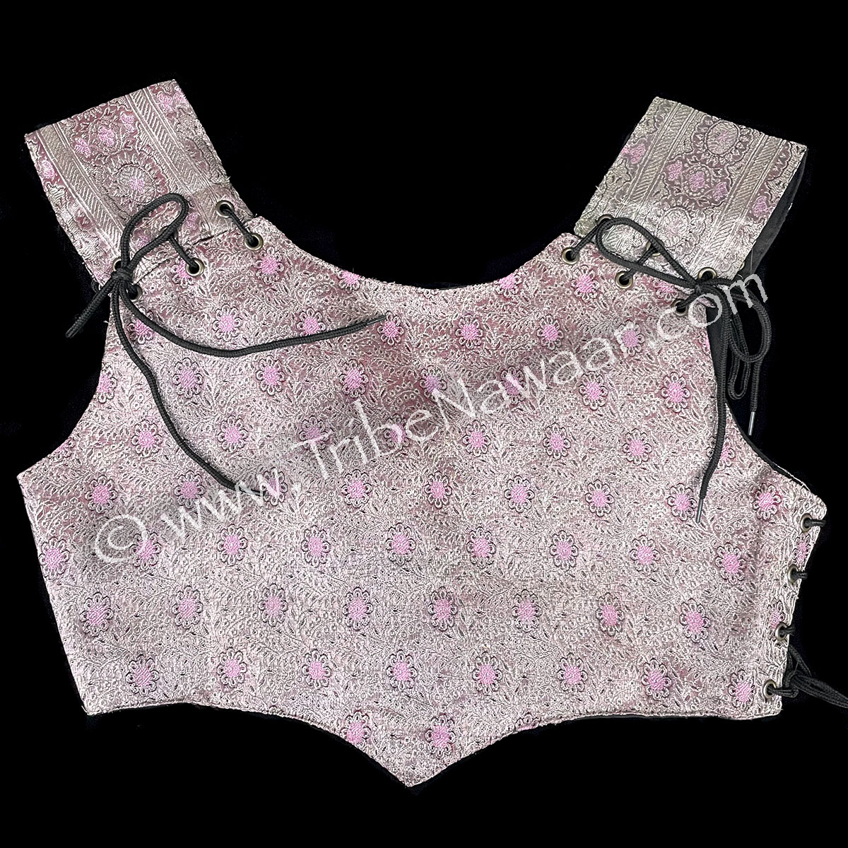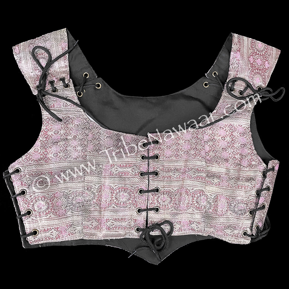 Eco-chic and environmentally-friendly, our Shimmering Rose bodice is newly constructed and assembled with vintage sari fabric in shades of dusty pink. Metallic accents in a silver-champagne, burgundy and pink tones add interest. The inside is lined with sturdy new black cotton fabric.