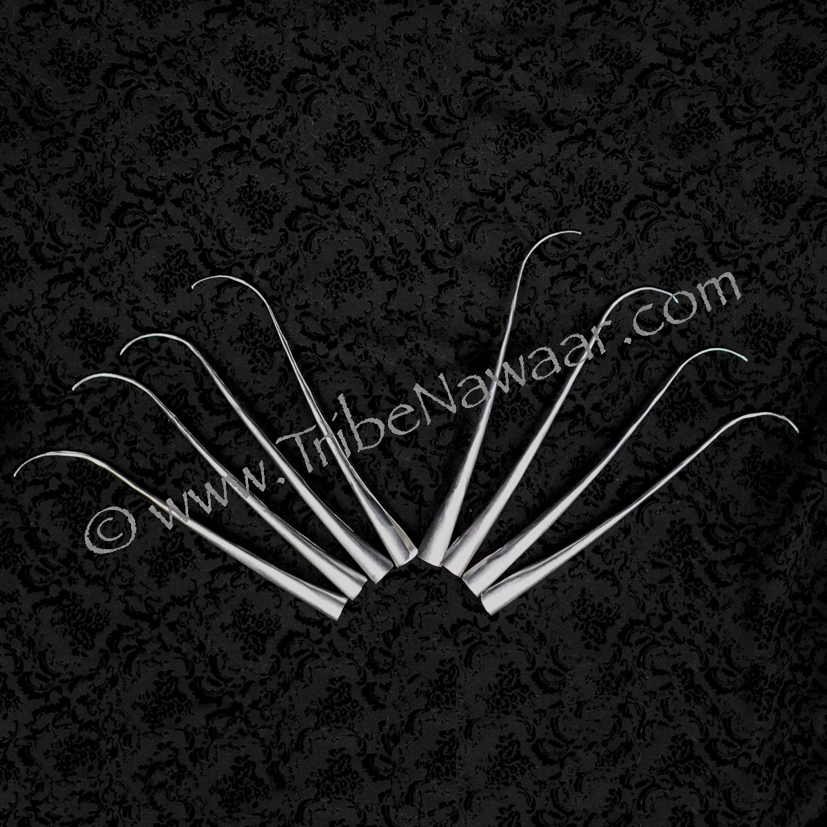 Traditionally used in the Fawn Lep (fingernail dances) of Thailand with the curved shape drawing up and away from palm of the hand. Curved shape accentuates the classical hand movements of the dance.