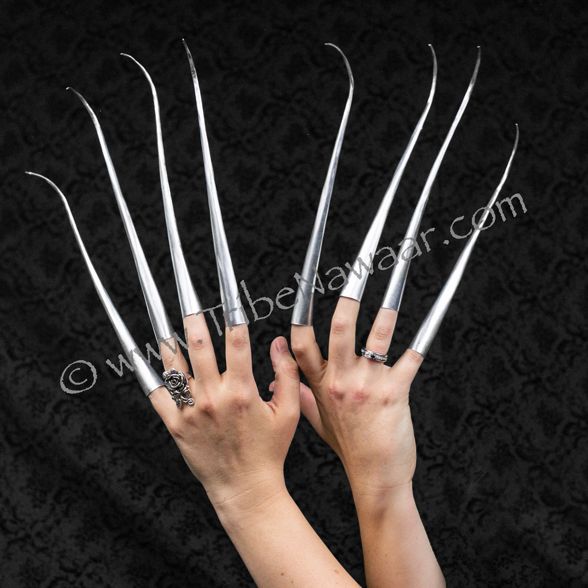By turning the fingers upside down (curve towards the palm) you can create a more claw or talon look for use in theater, themed costumes, cosplay and fusion dance styles.