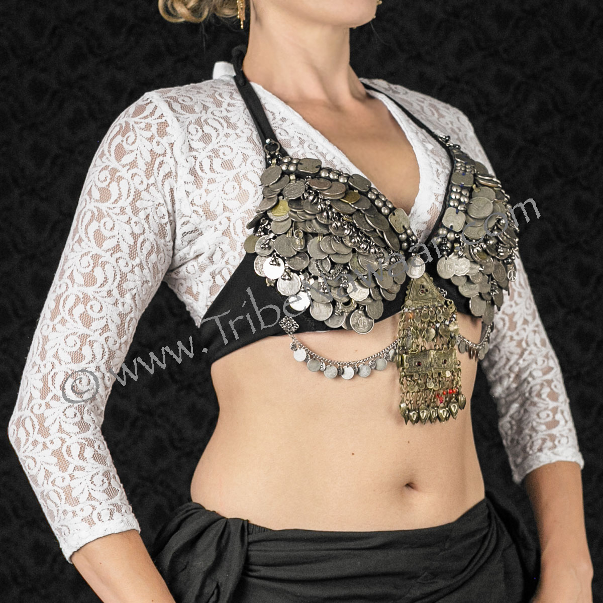 Our snow lace choli top is a favorite among tribal belly dancers. Sheer style lace pattern shows up beautifully against all skin tones. 3/4 sleeves design made with 4 way stretch lace provide comfort and full flexibility for all dance forms.