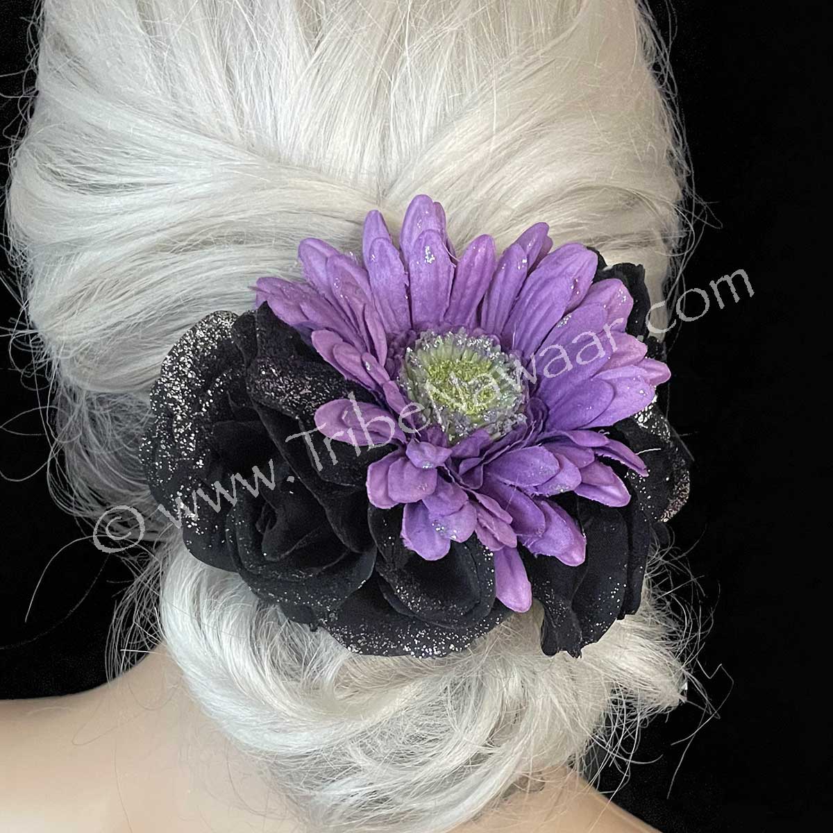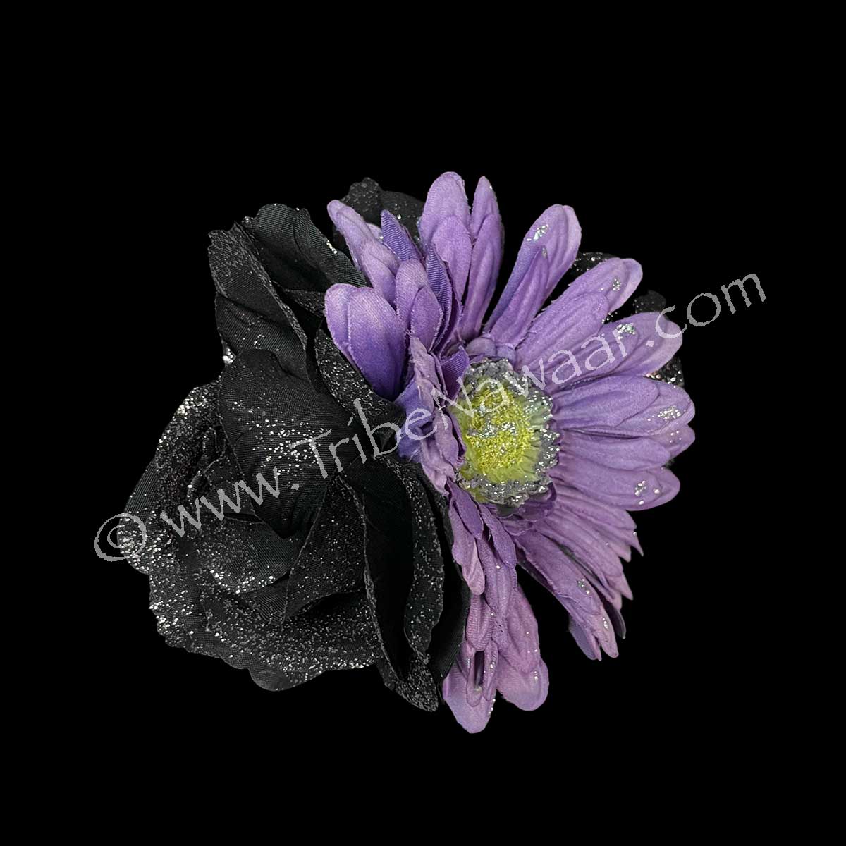 Soft purple Gerber daisy nestled in two black roses. Glitter shimmers add interest. On a sturdy hair clip.
