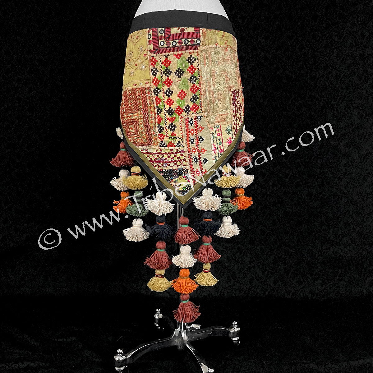 Scarf base features a patchwork of vintage embroidered fabrics. Predominately features colors are multiple shades of vintage cream with accents of red, black & green. Vintage fabric collage patchwork base. Mounted to a slightly stiff base for reinforcement. Sturdy double reinforced ties add a level of security during dance performances. Slight darting over back hips helps hug curves. Mirrors in textile base catch the light nicely with movement!