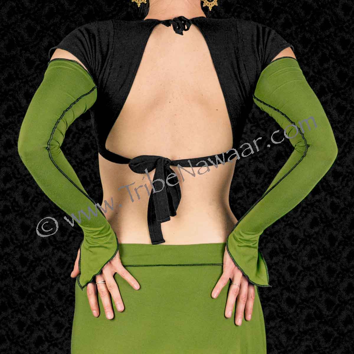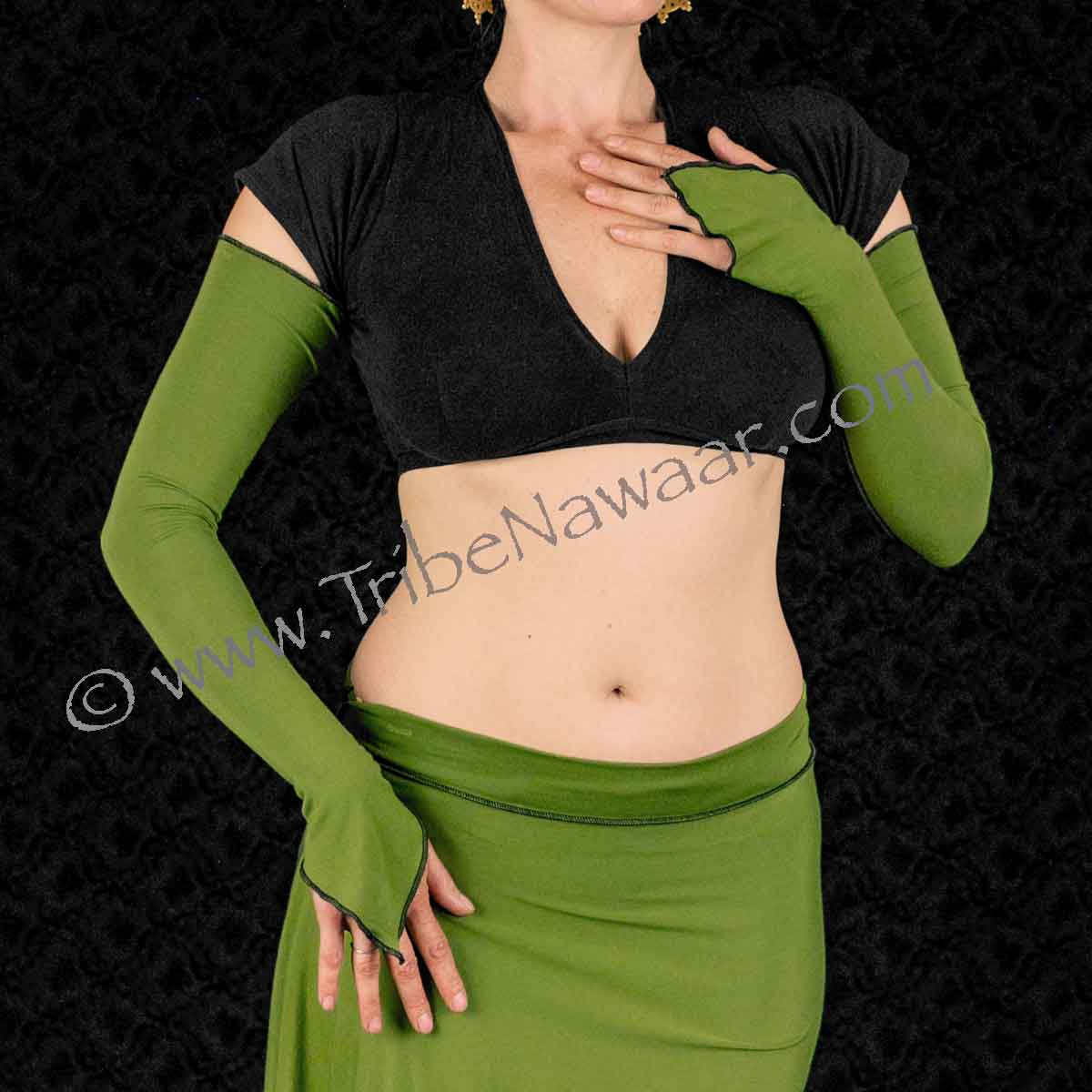 Our Spring Green Gaia Sleeves are made with super soft spandex rayon and feature black contrast stitching. A perfect compliment to our Gaia Skirts & Gaia Tops or paired with your favorite dance ensemble! These sleeves are ideal for transitional weather and for wearing to dance classes. Put them on when you are chilly- as the temperature heats up, simply slide them off! Rich coloring and full range of motion make them a great choice for performances, too!