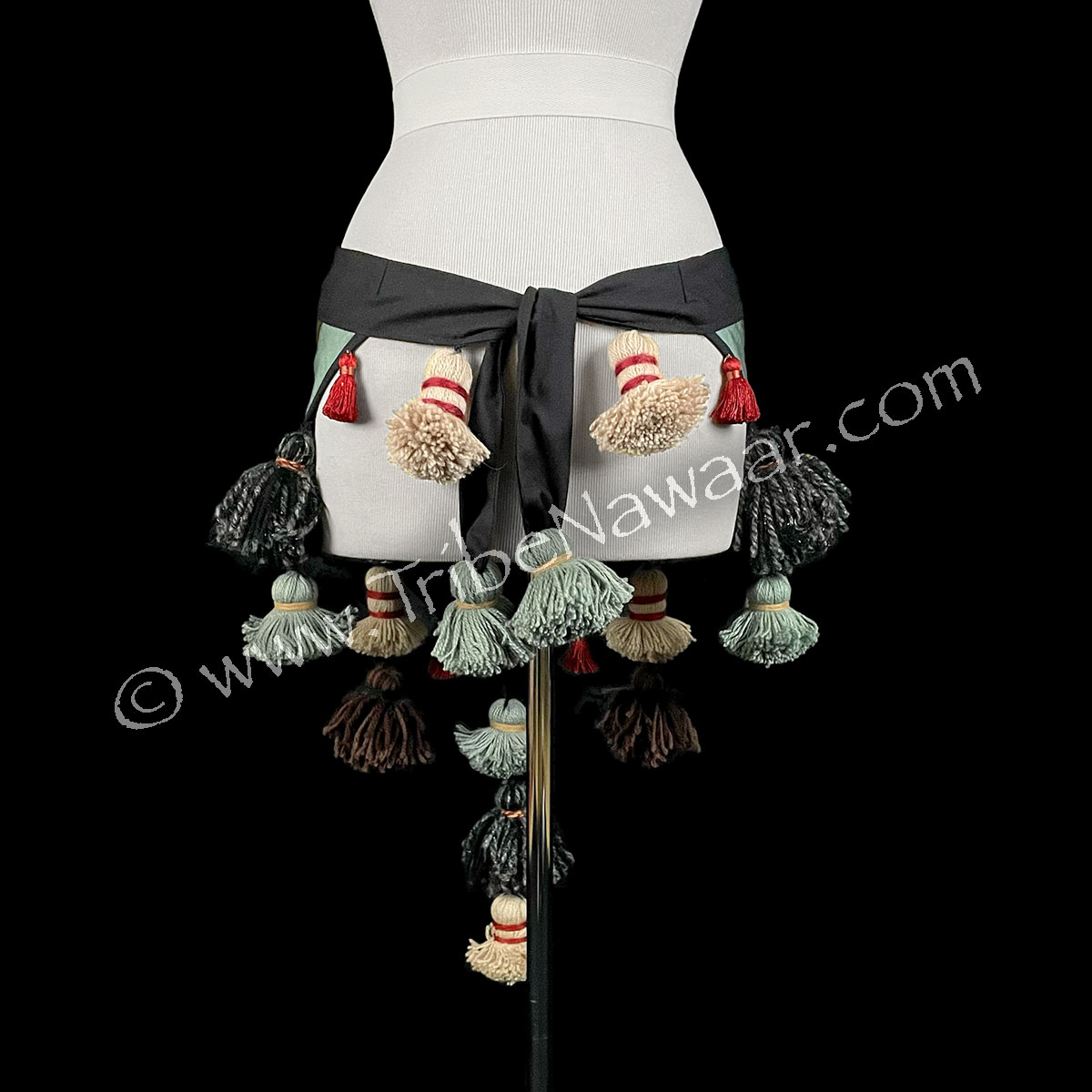 Who doesn’t love the classic belly dance tassel belt? Our spruce tasseled hip scarf is inspired by traditional camel headdresses. These belts add a colorful pop to any costuming and accent movement with their playful bounce and swing.