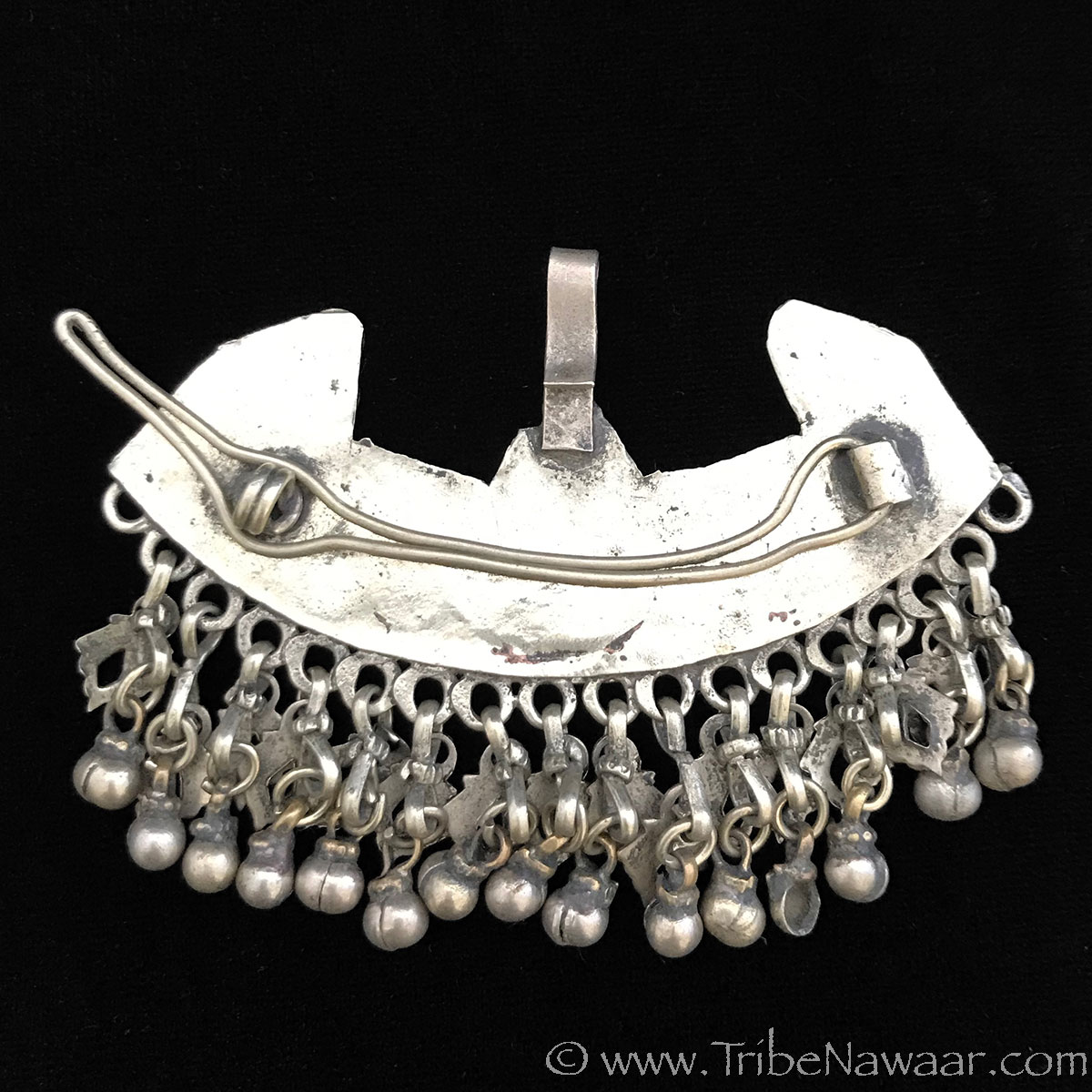 Approximately 3 1/8″ wide x 2 1/8″ tall. Includes a traditional pendant hook that can quickly be hooked to a necklace, tribal bra, etc.