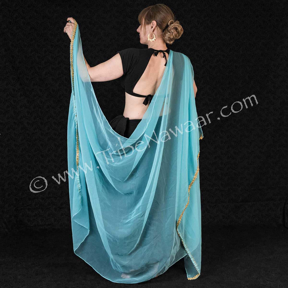 Veil is made of light blue flowing chiffon fabric accented with gold trim on the short ends. Veil can be used as a dance prop, light coverup or as a shawl.