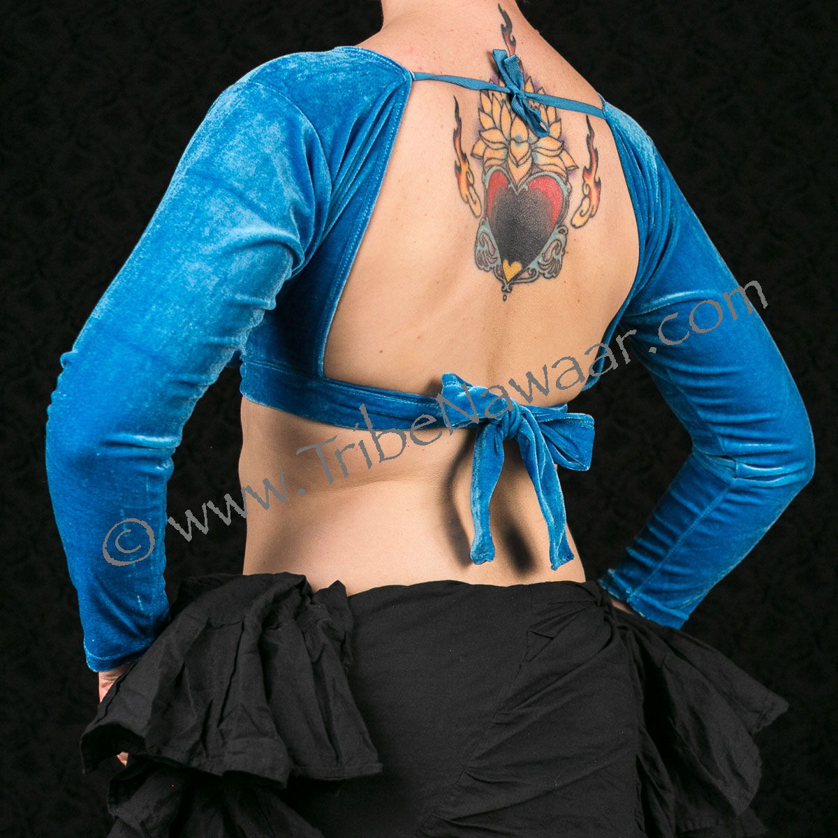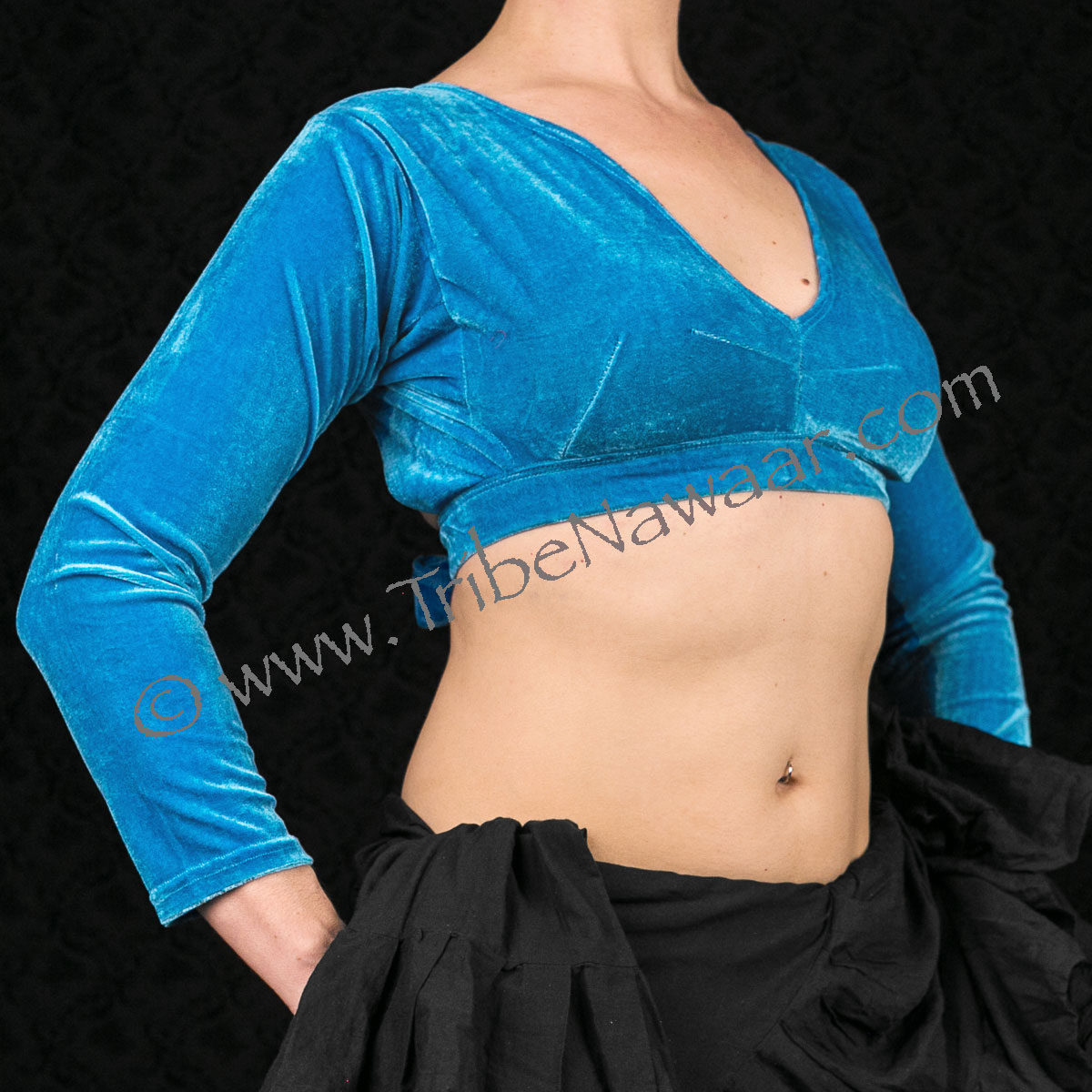 4 way stretch velvet fabric with long 3/4 sleeves design (depending on your arm length the sleeve will be between a 3/4 and a true long sleeve length). Note: the turquoise velvet may have a slightly different texture than the other colors.