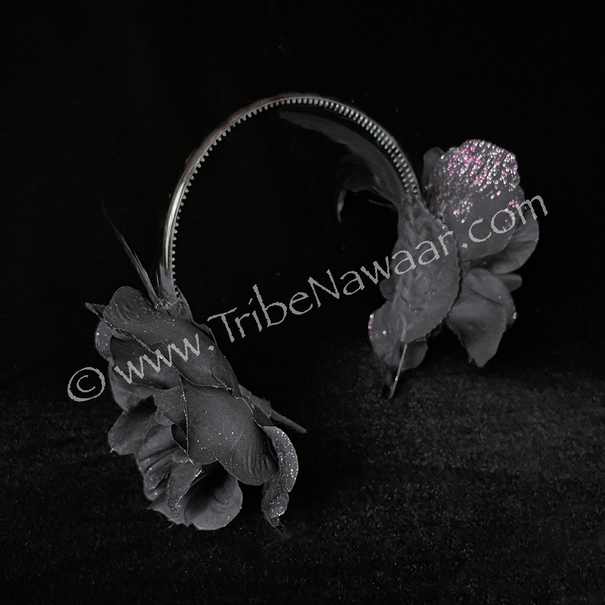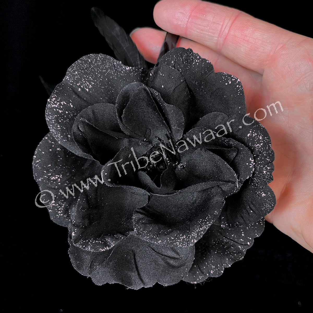 Deep black roses with a leaf support structure. Silver and rose toned glitter accents and black coque feathers adds interest.