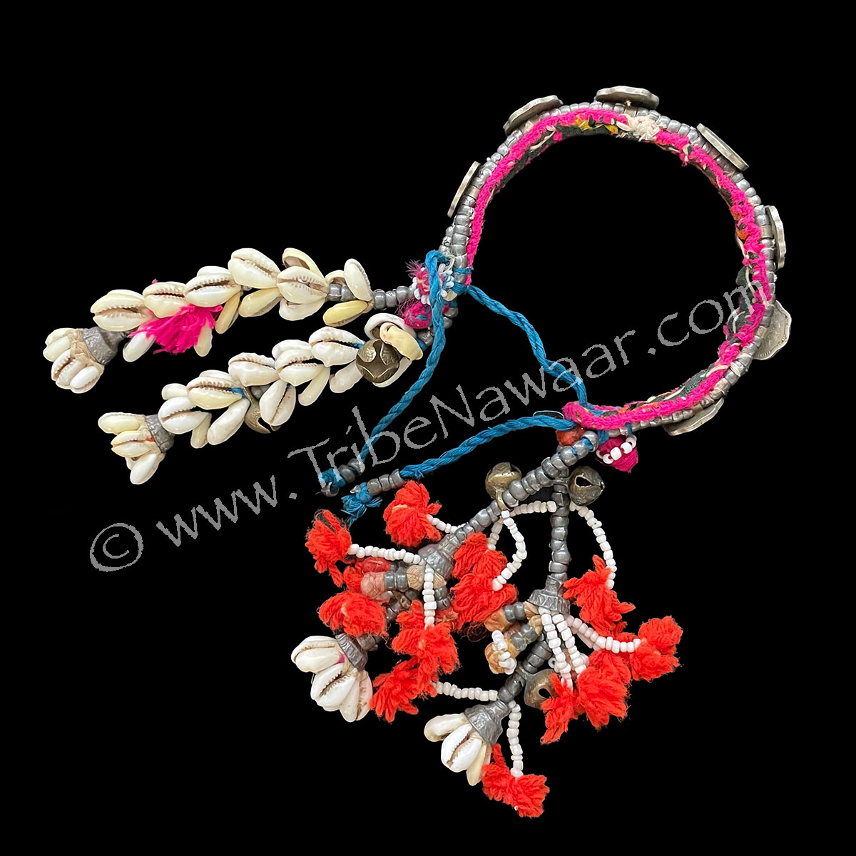 Authentic vintage jewelry. All details are hand sewn and sturdy. Accented with coins, metal beads, fuchsia crochet work, cowers shells, white beads, bells & fuchsia and orange poms. A matching pair of cowrie falls hang down from one end. The other end features metal/cowrie tassels and white bead with orange pom accents. Pewter silver tone to metal beads and finials.