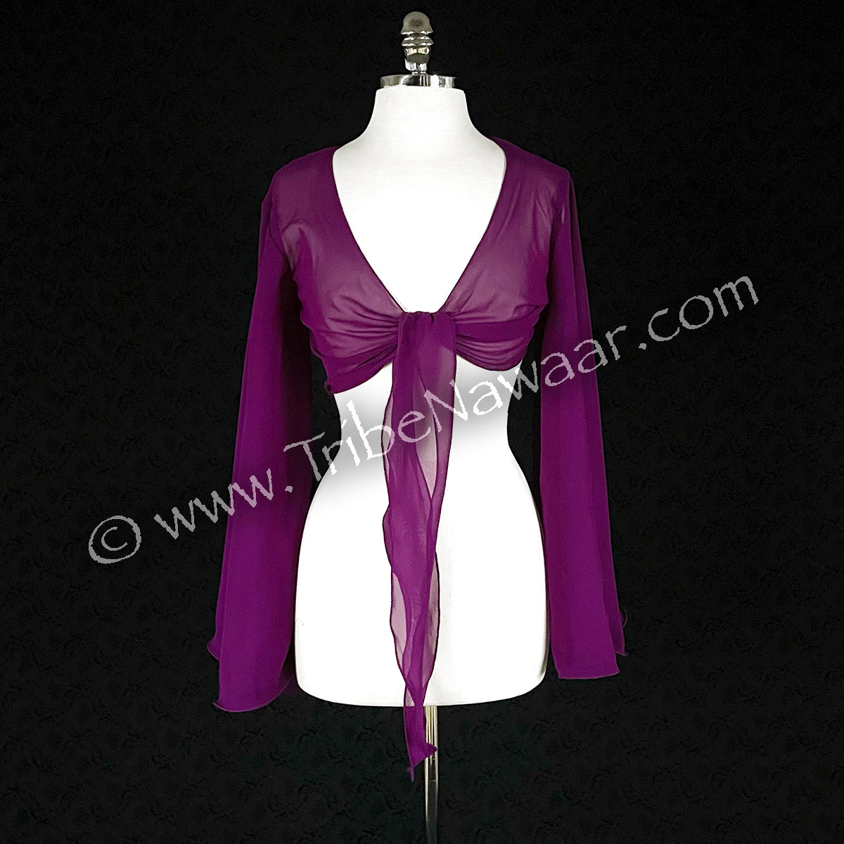Rich violet purple chiffon wrap top. Unknown fabric (no tags) in this professionally made top. Flowing bell sleeves. Wrap design features long ties and generous sizing to fit a large variety of sizes. This sheer top can be worn over standard lingerie bra.