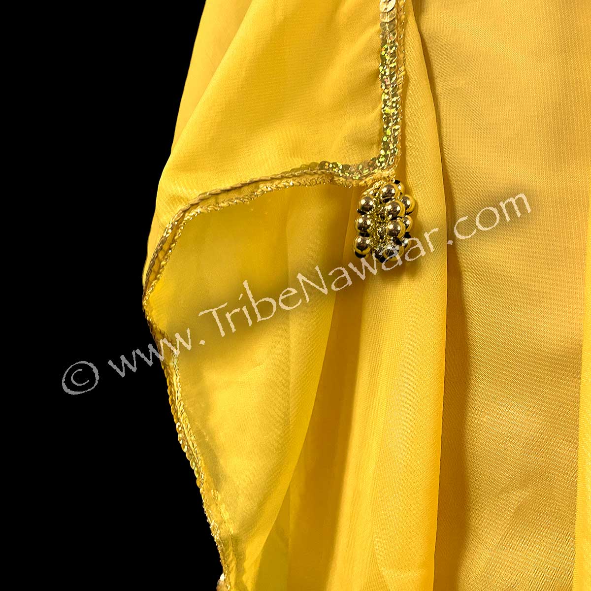 Rich yellow chiffon fabric. Slightly sheer. Lined at hips for added modesty. Vertical handkerchief ruffles flow with movement and are accented with gold sequin along the edges. Beaded loops at the tips of each ruffle add interest.