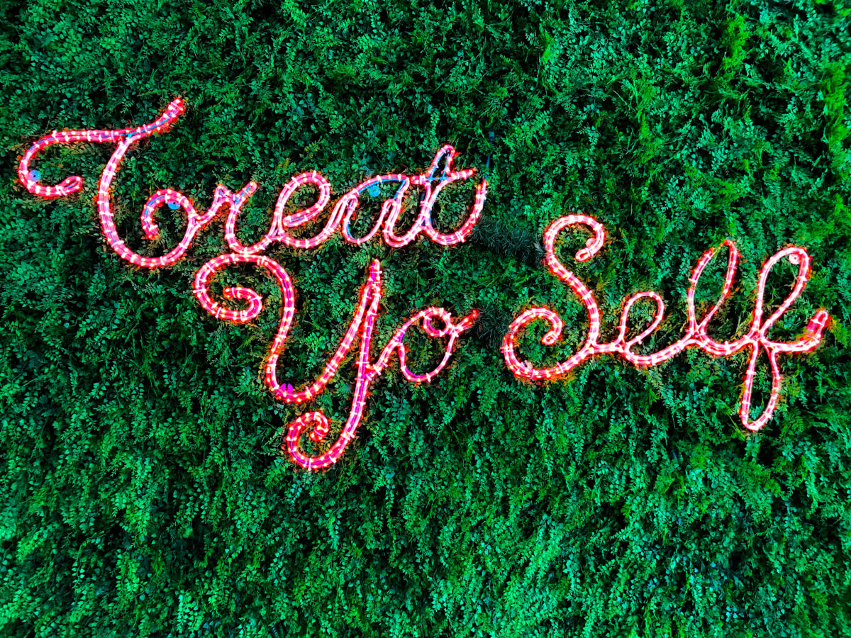 The ‘Treat Yo Self’ art installation is part of a public art exhibit on display at the 29th Street Mall here in Boulder (alas, no artist credits are listed for this piece.. if we find out more, we’ll update the post or add a comment below). Be sure to check it out if you are in the area. It’s large and you a couple friends can stand in front of it to get a great selfie!