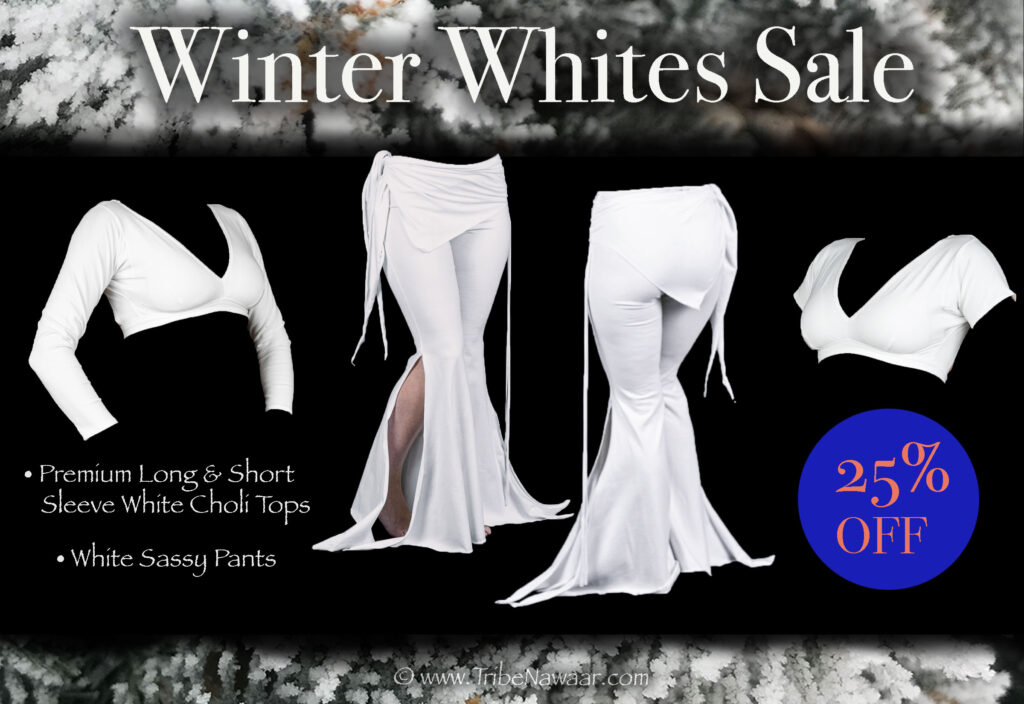 25% off our white sassy pants or long or short sleeve premium white choli tops. Limited to stock on hand and while supplies last.